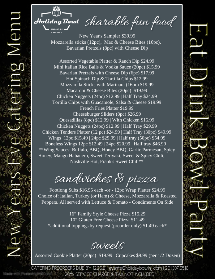 orders in by Sunday 12/26/2021 by emailing events@holidaybowlnj.com or calling